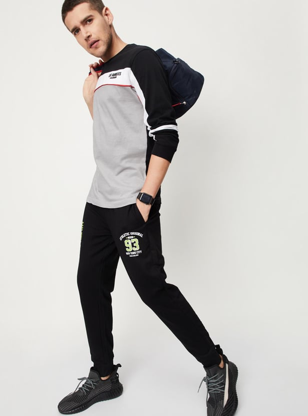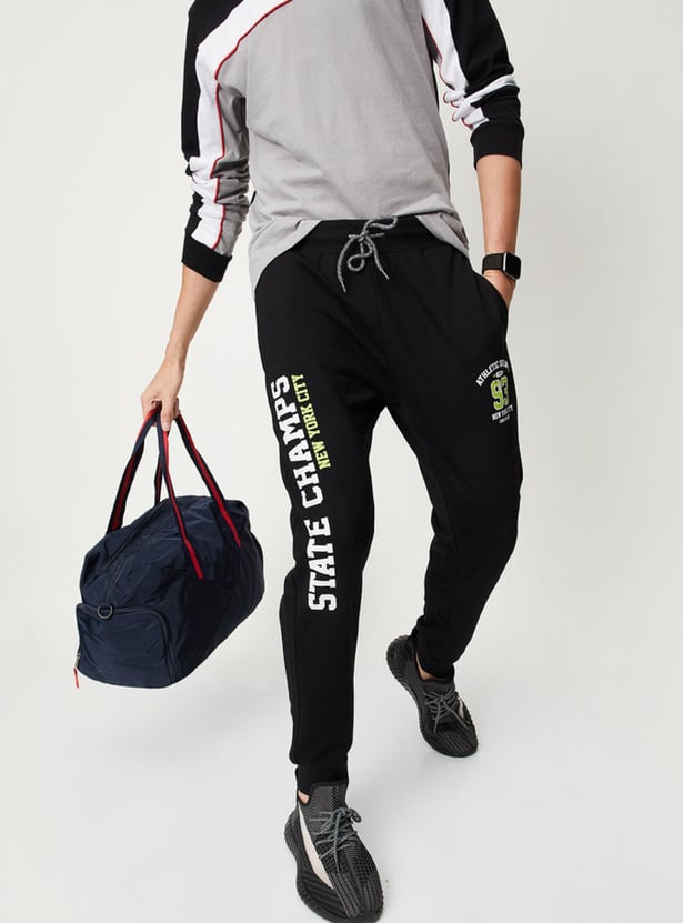 Hit the gym in style in this pair of joggers with a typographic print on the sides. It features a drawstring waist, side pockets, a back patch pocket, and ribbed cuffs. Style this pair of joggers with a tee and sneakers for a sporty, comfortable look.