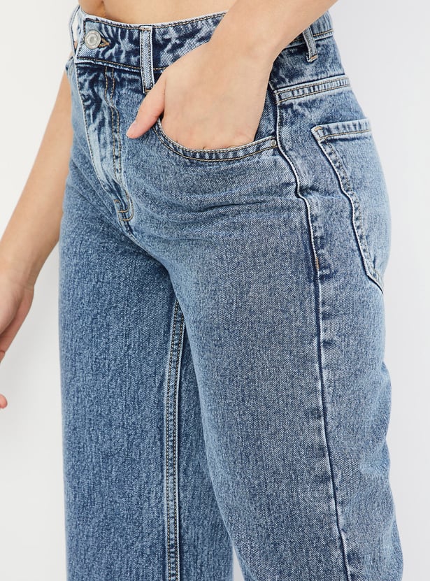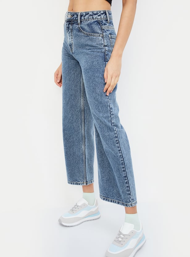 Show off your chic style with these jeans boasting a washed finish. They come with a belt loop waist, five pockets, and a wide leg profile for a trendy silhouette