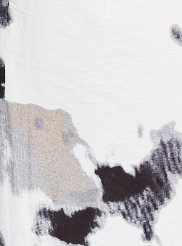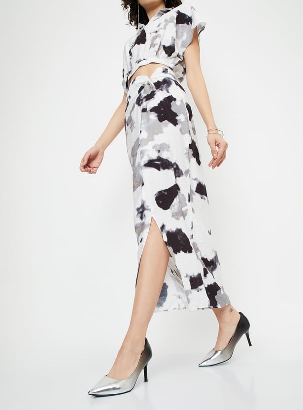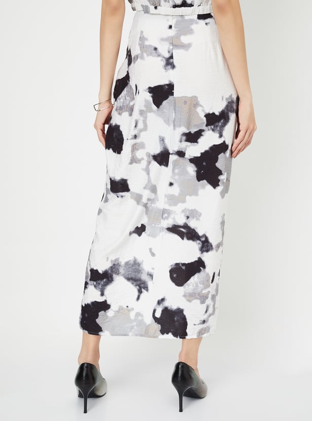 Elevate your style with this stunning printed draped skirt. Featuring a front slit for a touch of allure, this midi-length piece is designed with a convenient zip closure for easy wear. The flowing fabric and eye-catching prints make it perfect for both casual outings and dressy occasions.