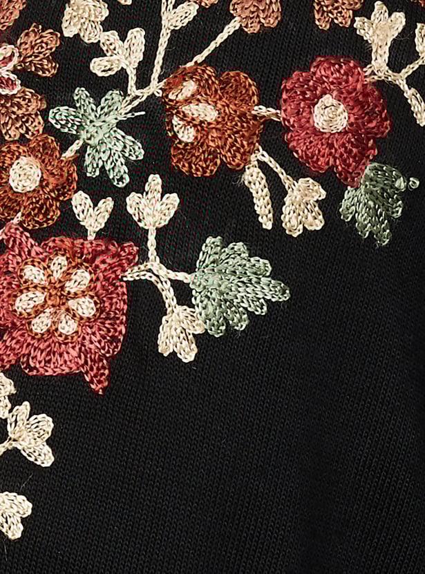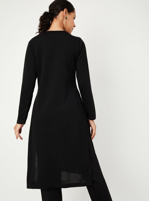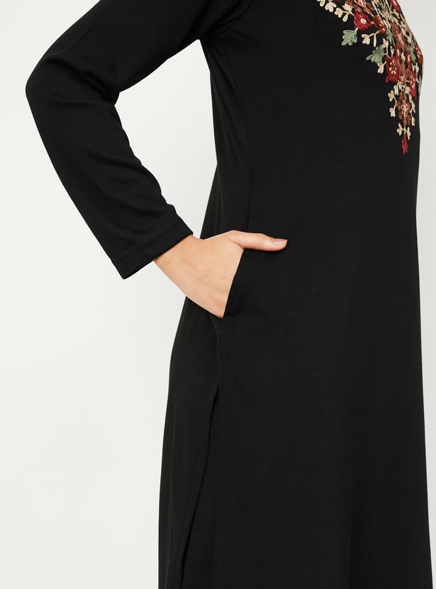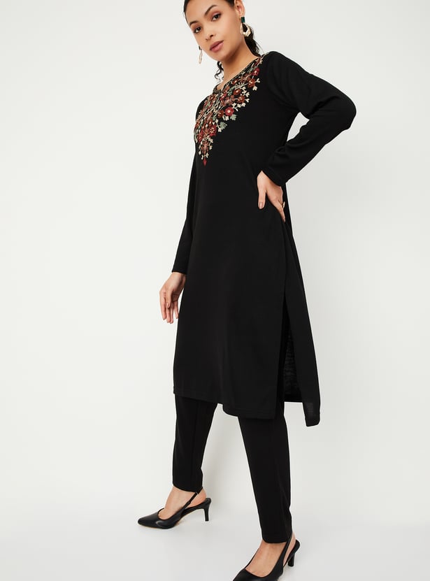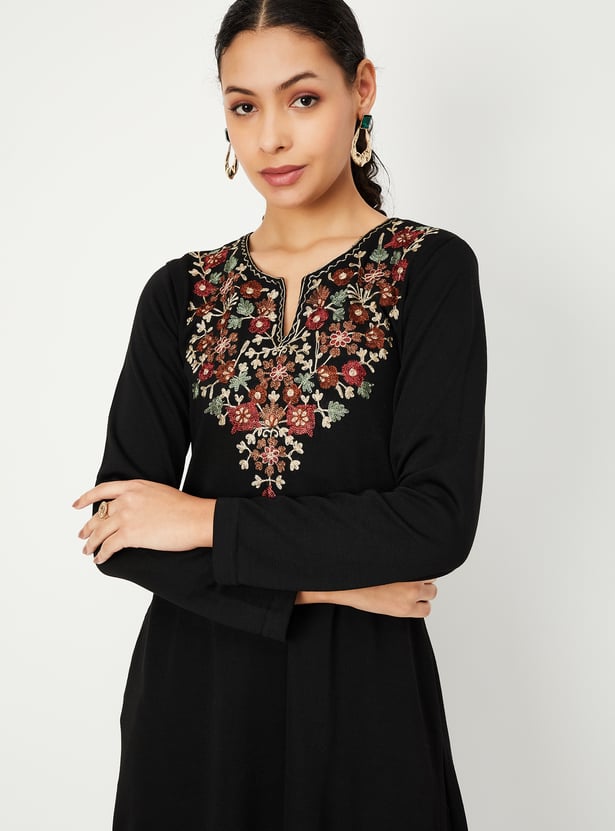 Embrace winter in style with this beautifully embroidered kurta. It features a notched neckline, full sleeves, and a calf-length design that exudes elegance.