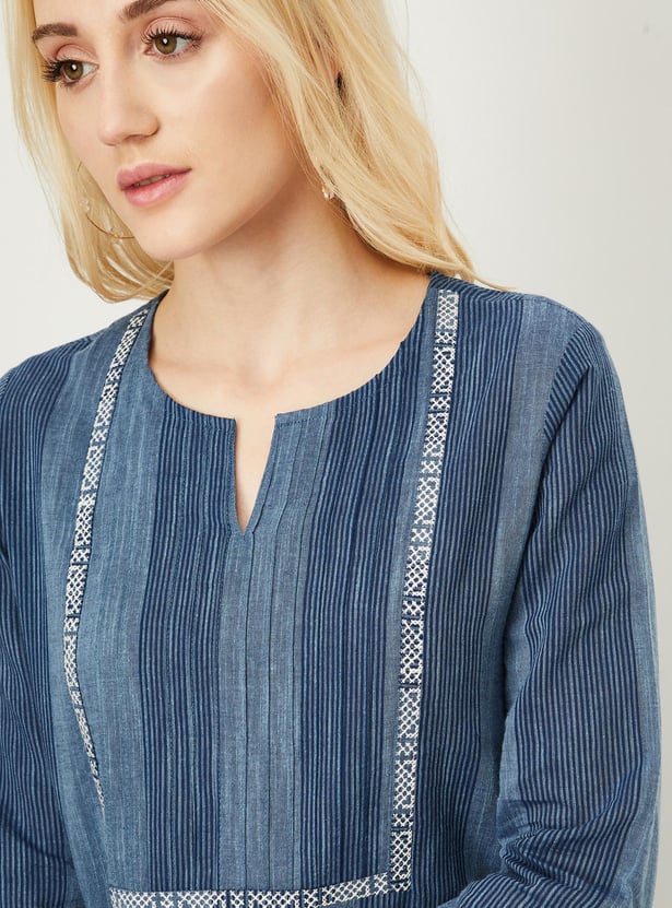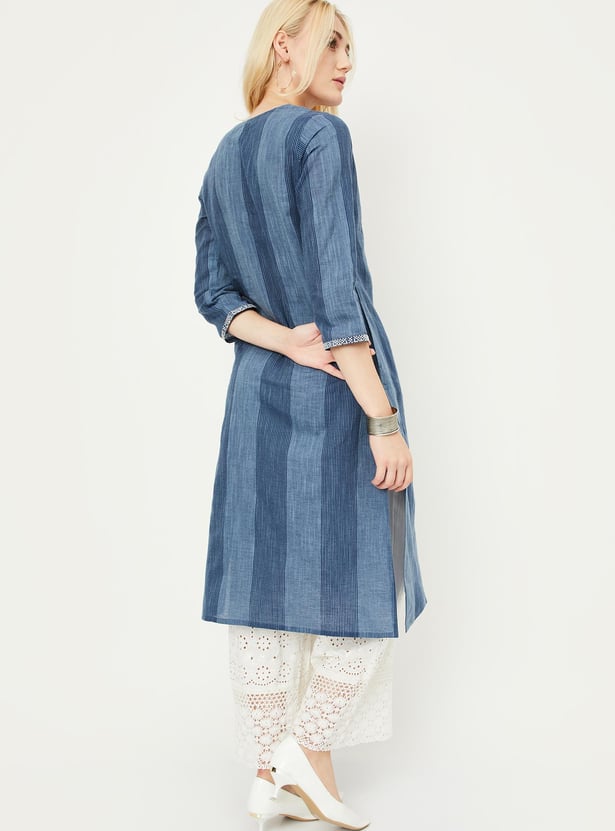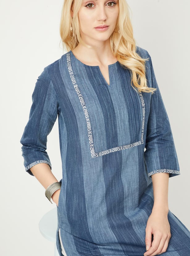 Liven up your daily styling with this straight kurta that is highlighted with a striped pattern. It features a notched neckline, three-quarter sleeves, and a waist pocket.