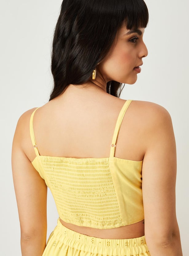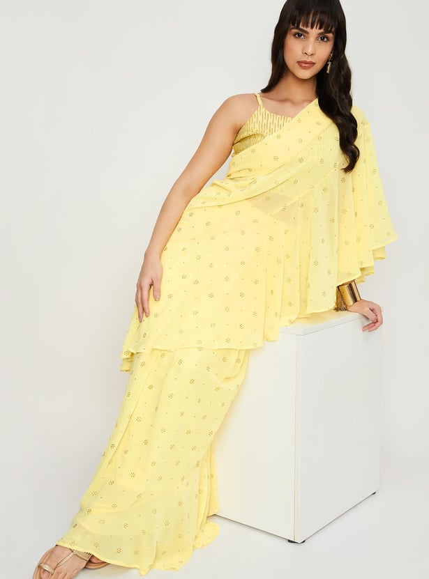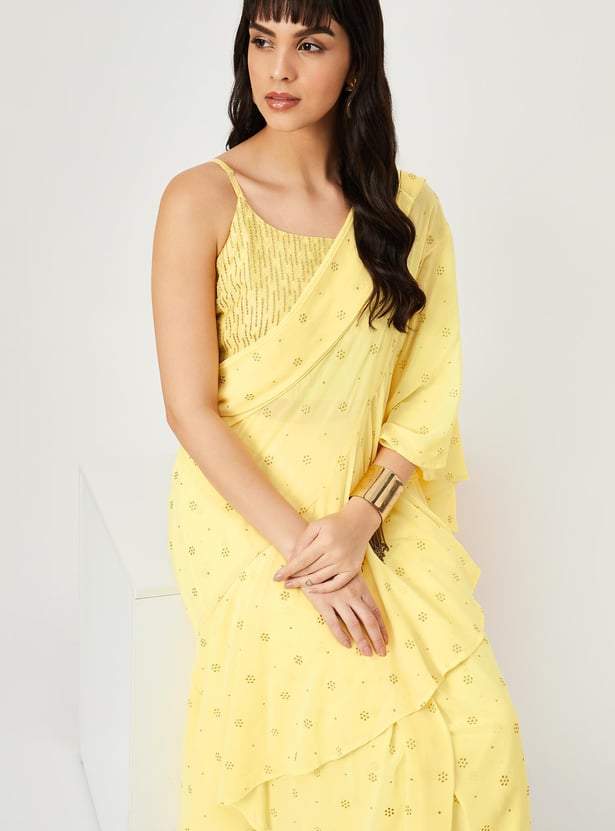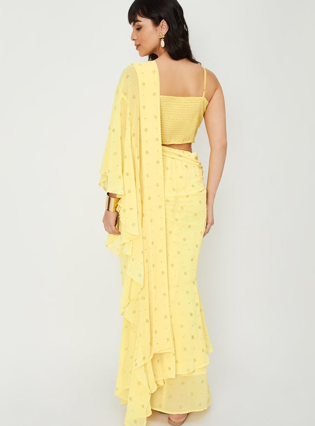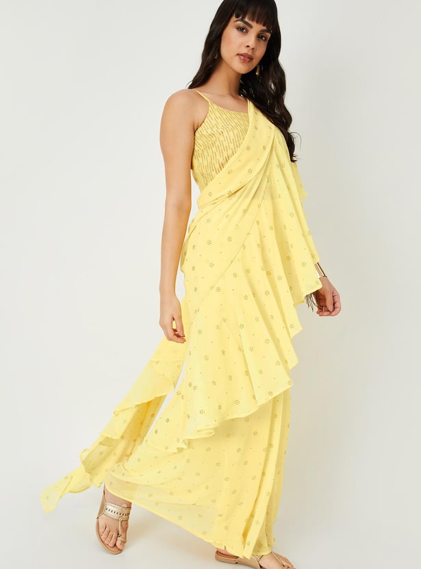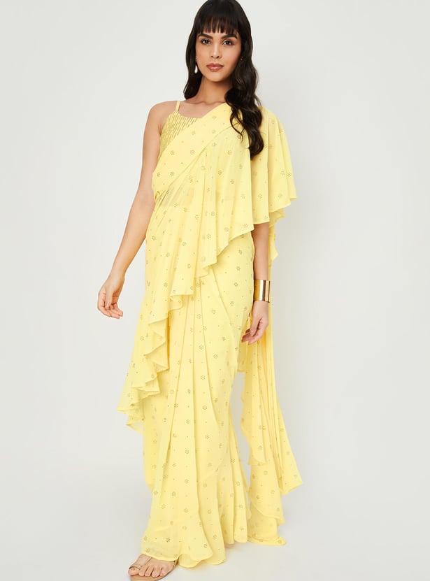 Glam up your look for the season with this saree set. It includes an embroidered blouse with a round neck, sleeveless construction, a back-button closure, and a crop profile. The pre-stitched saree comes with an elasticated waist, a long skirt, a pleated front, and an elegant pallu with ruffled detailing. Pair this saree set with flat sandals and a clutch to gear up for a memorable evening.