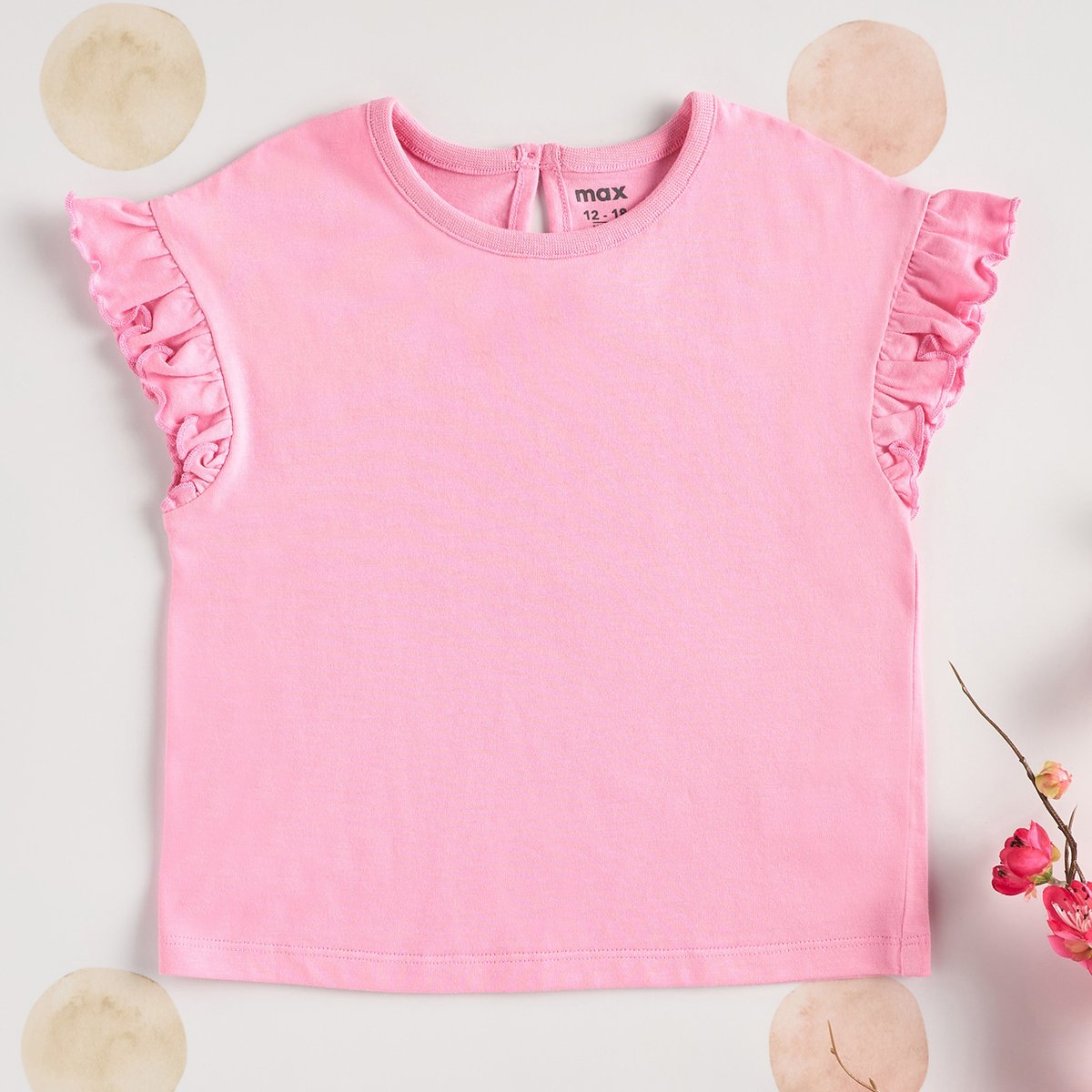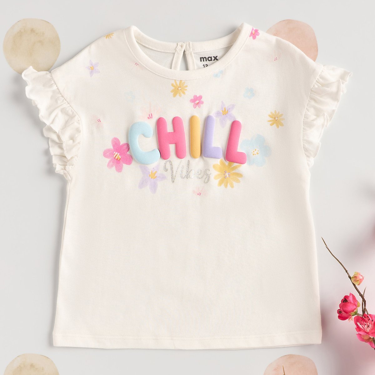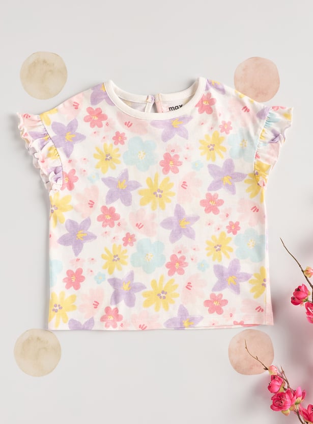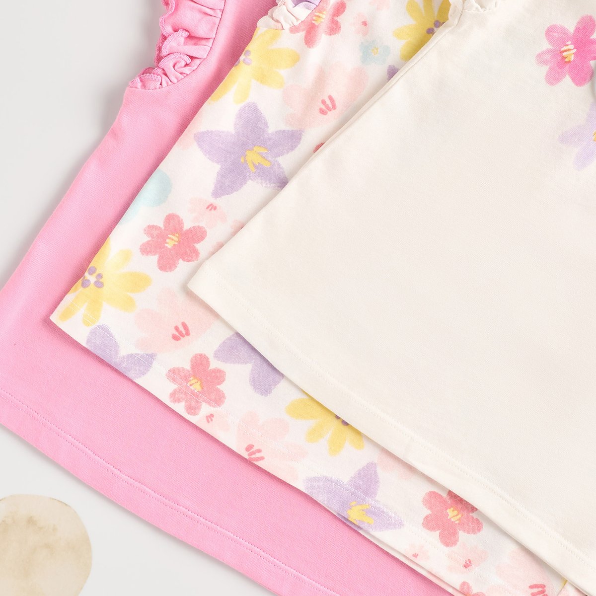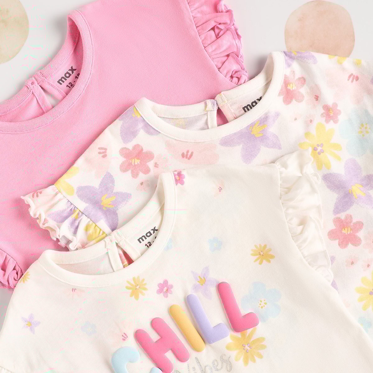 Spruce up her casual wardrobe with this set of three T-shirts, each showcasing unique assorted prints. Featuring a round neck with a button closure and flutter sleeves, these T-shirts bring a playful and stylish flair to her everyday outfits, making them perfect for easy, breezy styling.