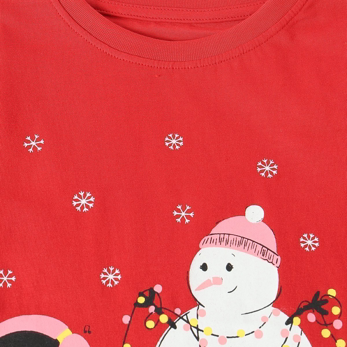 Get your little one ready for winter fun with this adorable T-shirt. Featuring a cheerful snowman print, a round neck, and half sleeves, this tee effortlessly combines comfort with festive flair. It's the perfect choice for holiday adventures and cosy days.