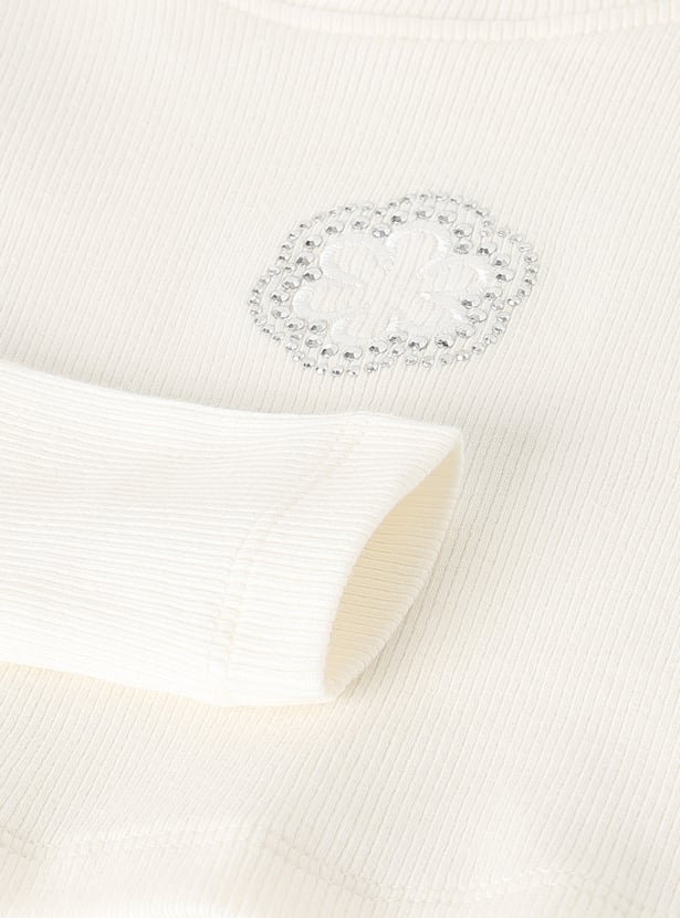 Add a touch of charm to her wardrobe with this top. The rib knit pattern with floral detailing adds cosiness and a hint of sparkle. The full sleeves offer extra warmth for cooler days.