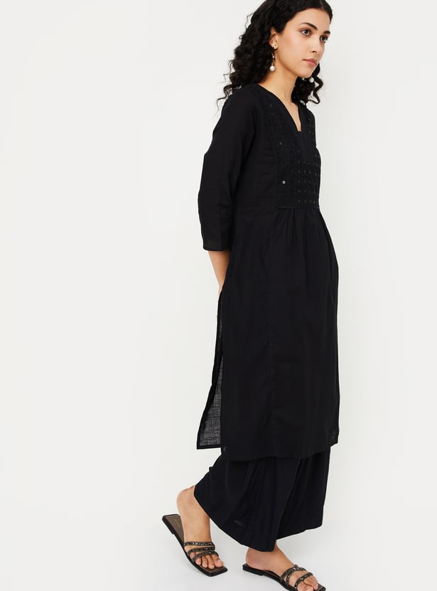Embrace the winter season in style with this elegant kurta. Featuring a round neck, full sleeves, and a convenient waist pocket, it boasts a flattering calf-length profile. The jacquard patterns and cuffs lend an alluring touch, adding sophistication to your ethnic winter wardrobe.\\\\\\