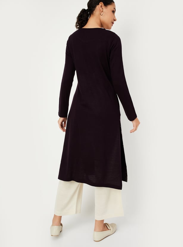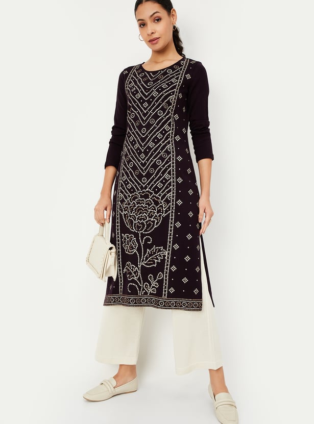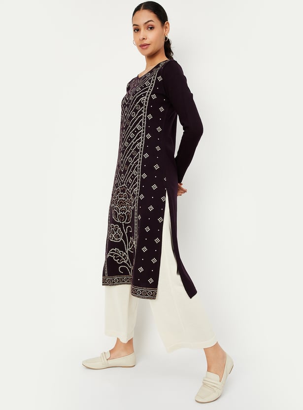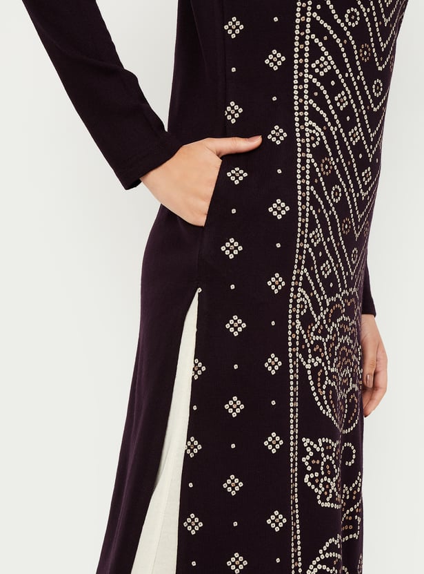 Raise the bar for ethnic winter styling with this exquisite straight kurta. Adorned with a printed pattern at the front, it showcases a round neckline, full sleeves, and a convenient waist pocket, all while boasting a flattering calf-length profile.