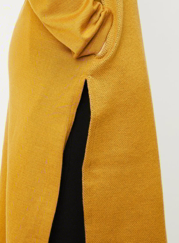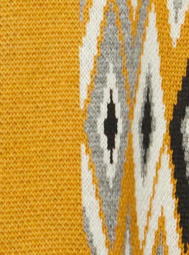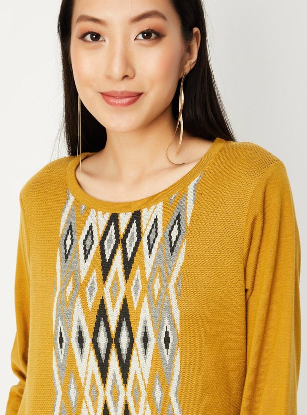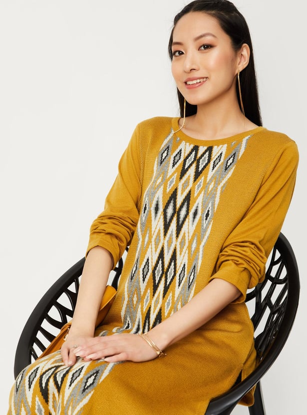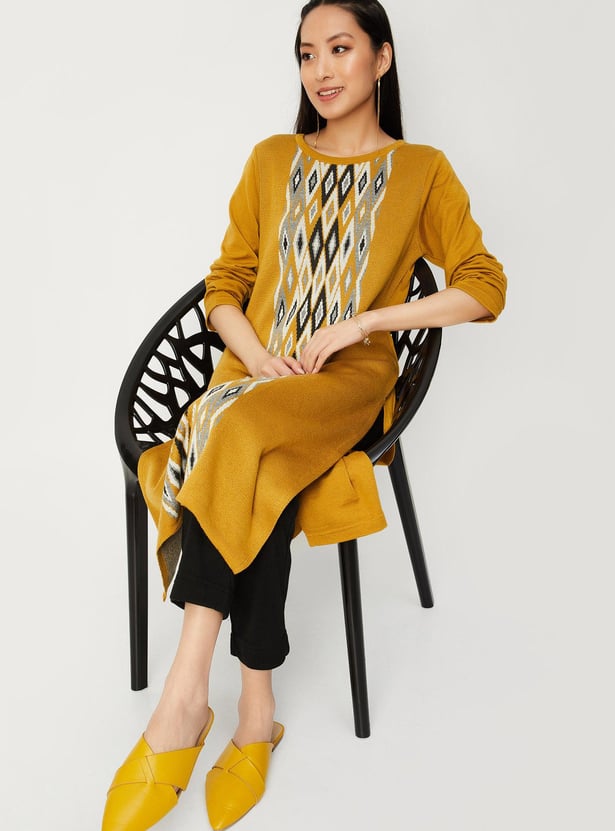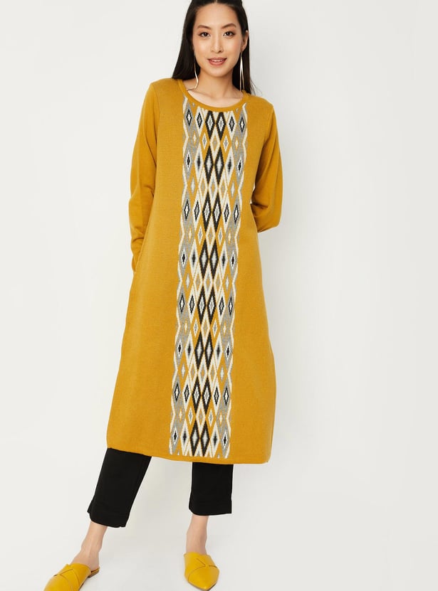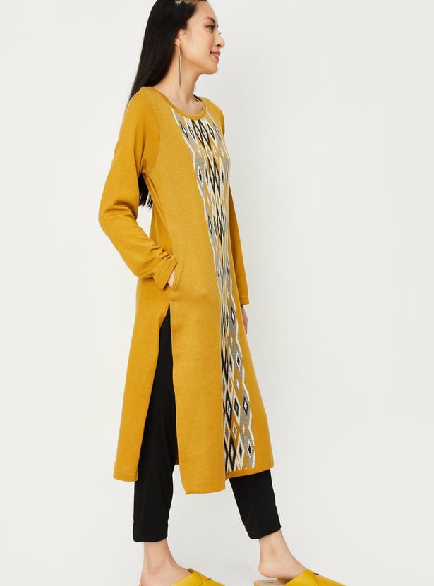 Embrace the winter season in style with this jacquard kurta. It features an argyle pattern, a round neck, full sleeves, pockets and calf-length construction. Style it with palazzos and sandals, along with a sling bag, to complete the look.