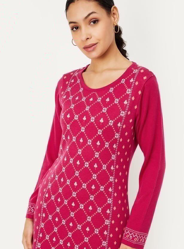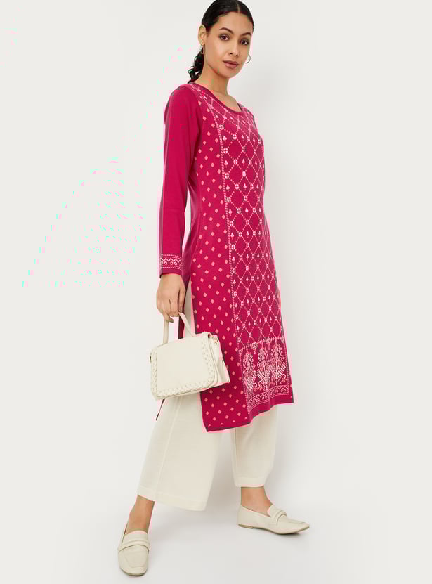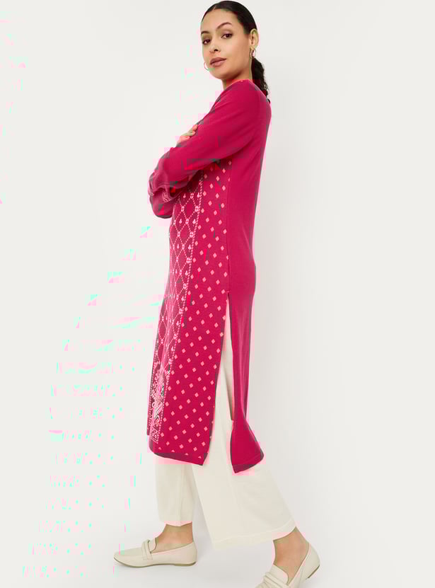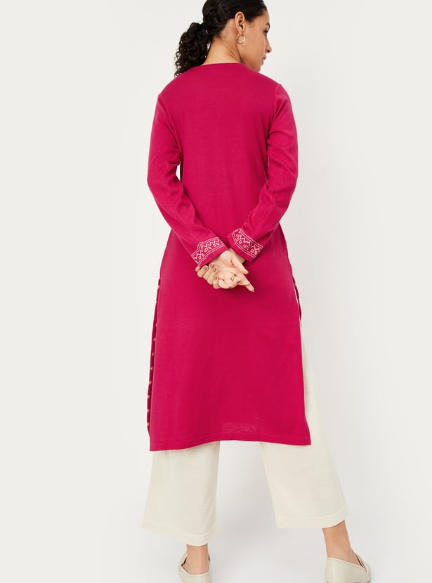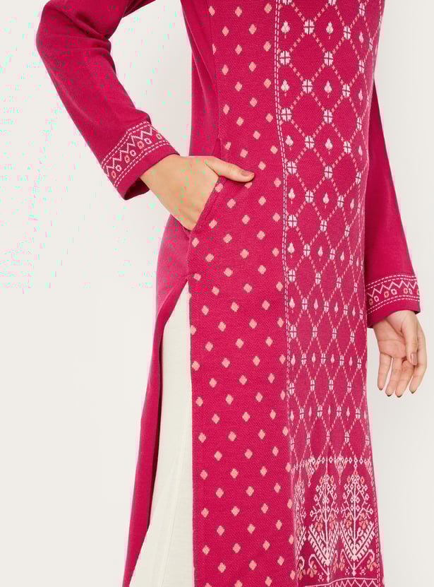 Embrace the winter season in style with this elegant kurta. Featuring a round neck, full sleeves, and a convenient waist pocket, it boasts a flattering calf-length profile. The jacquard patterns lend an alluring touch, adding sophistication to your ethnic winter wardrobe.
