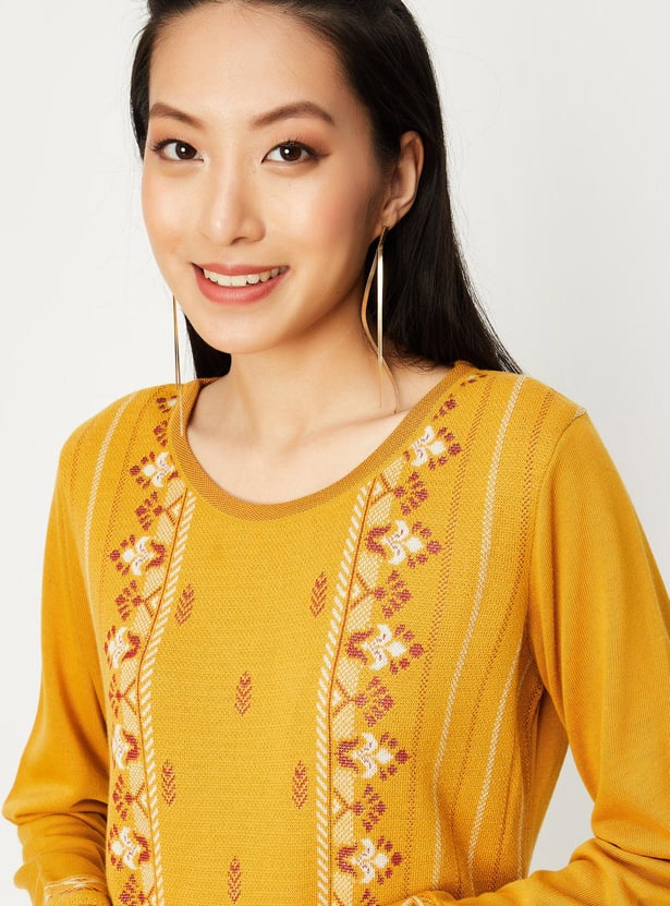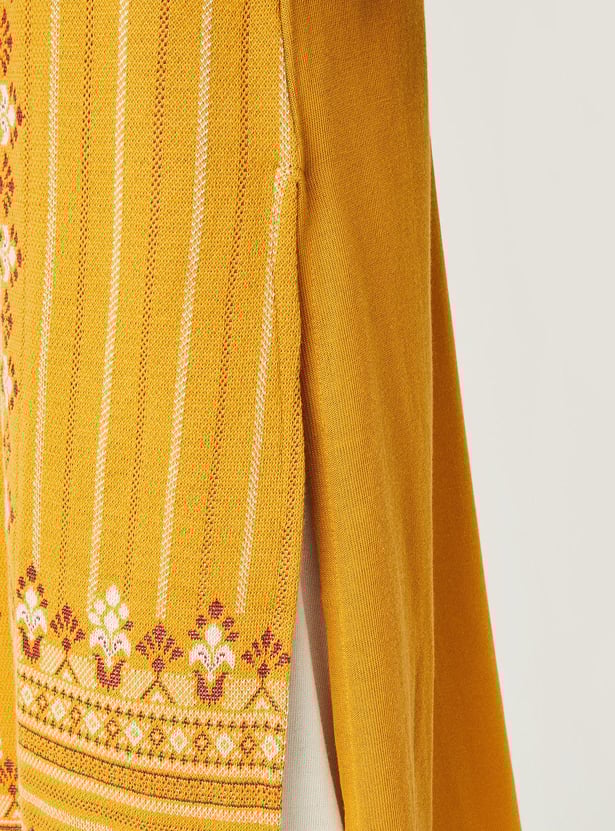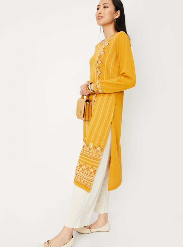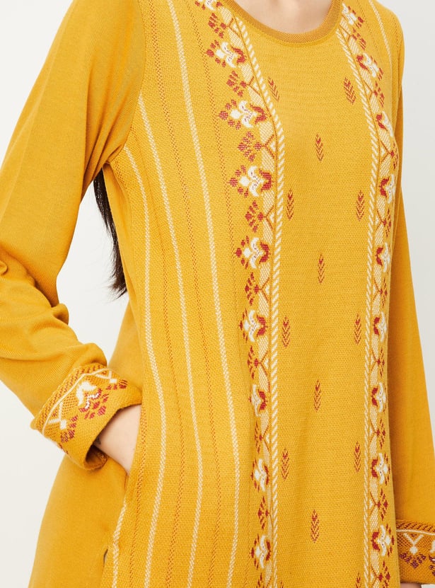 Embrace the season in style with this winter kurta, featuring a jacquard pattern, round neck, full sleeves, and pockets. Team this with a pair of palazzos and sandals, along with a sling bag.