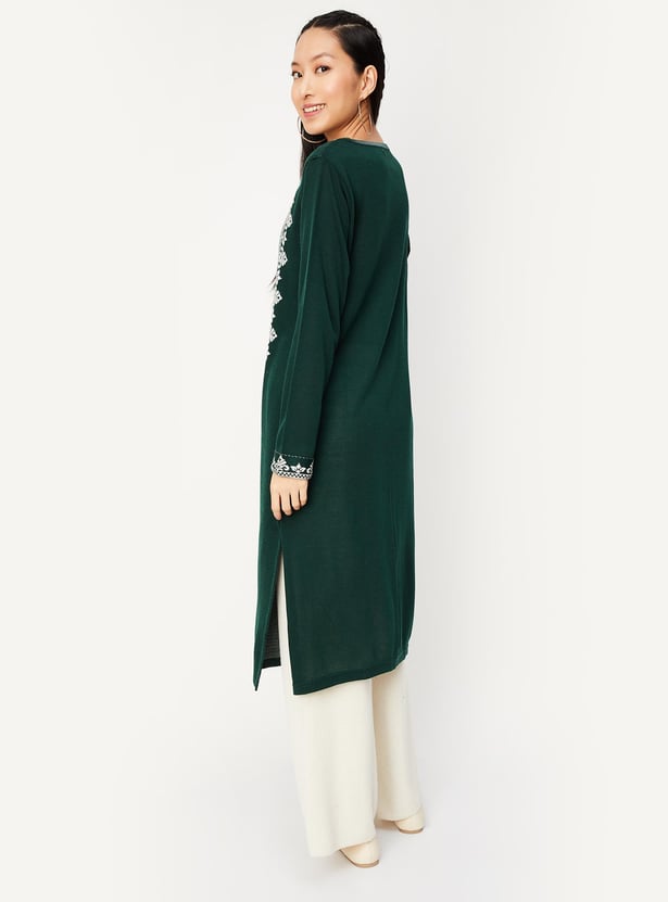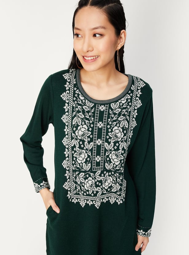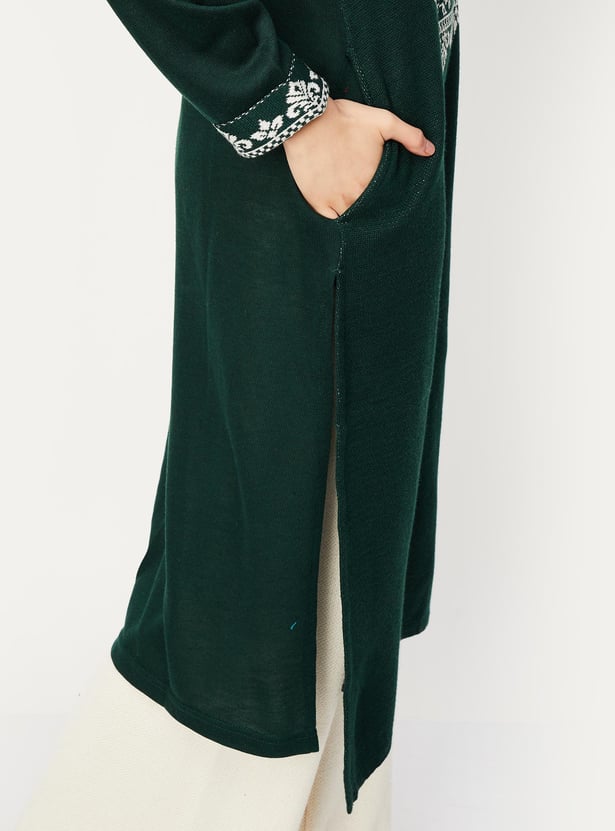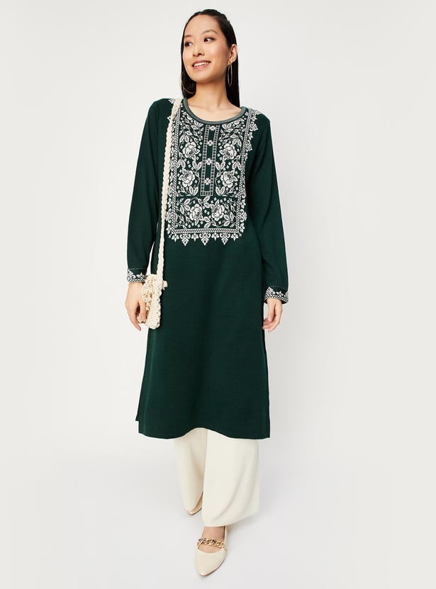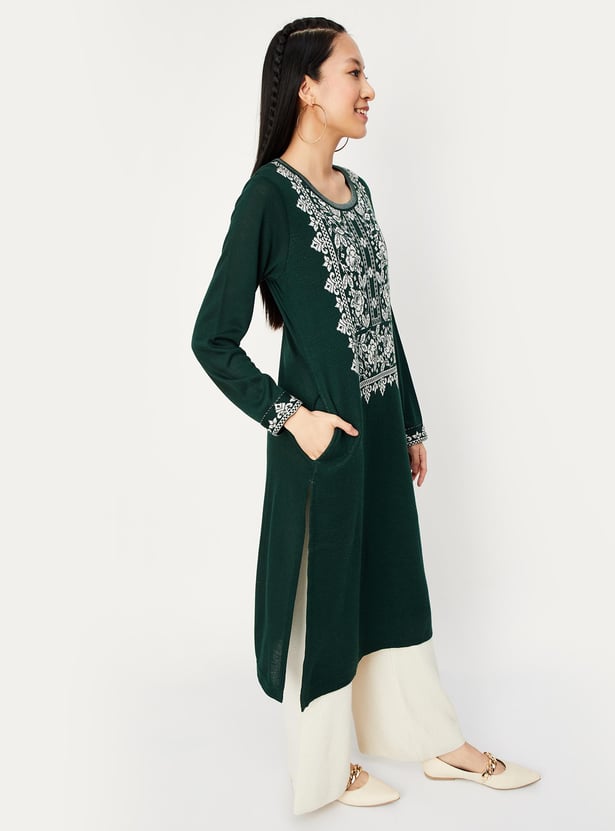 As the temperature drops, combine cosiness with elegance with this kurta. It features a round neck, full sleeves, a waist pocket, and a calf-length profile. The jacquard patterns on the yoke and cuffs lend an alluring touch. Team up this kurta with palazzos and ballerinas for an elevated look.