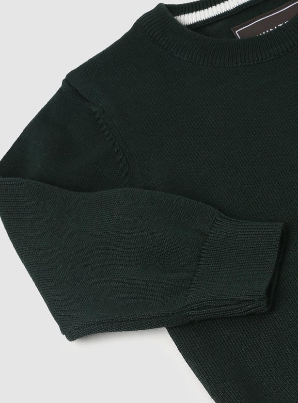 Induce comfort and style to your child's wardrobe with this sweater. It has a crew neckline, ribbed hemline, and full sleeves. Give your child the opportunity to upgrade his style by teaming this sweater with a pair of jeans and lace-up shoes.