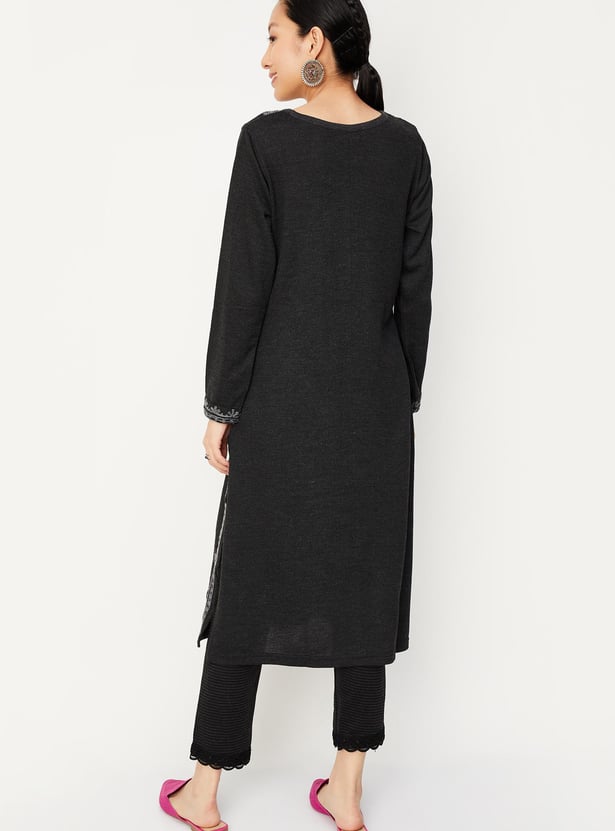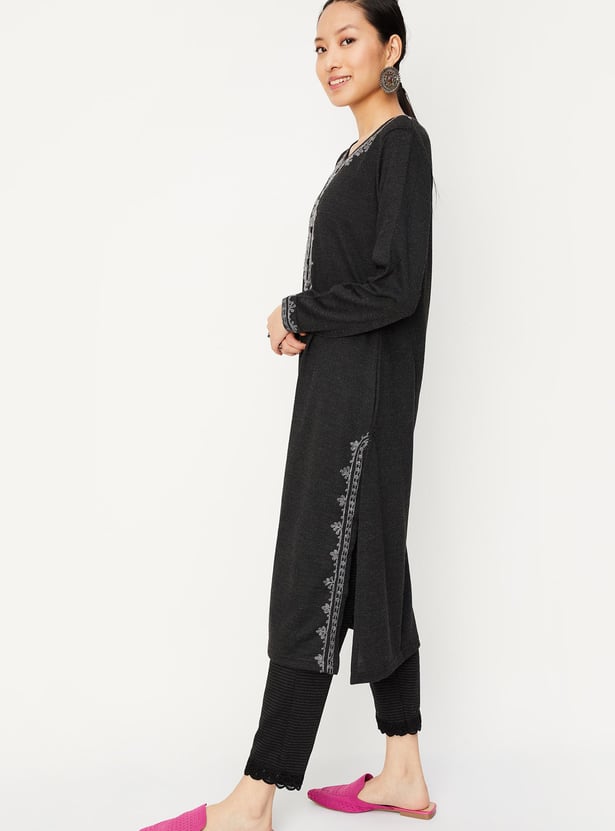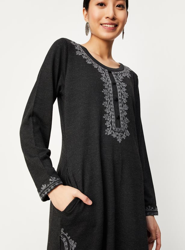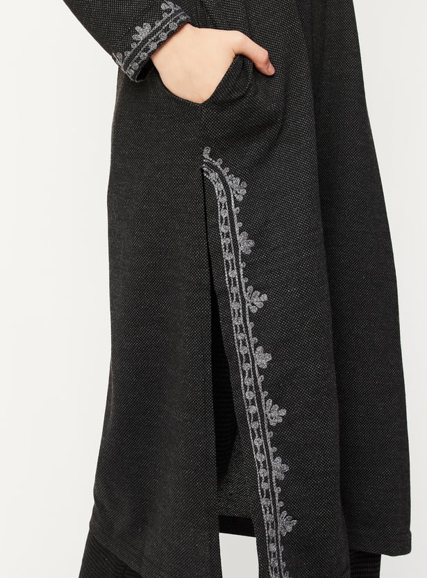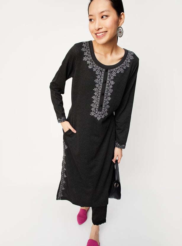 Raise the bar for winter styling with this straight kurta. It is highlighted with embroidered detailing. This kurta has a round neck, full sleeves, a waist pocket, and a calf-length profile. Style this kurta with palazzos and ballerinas for an elegant look.