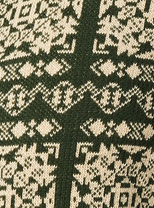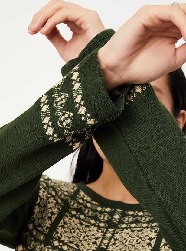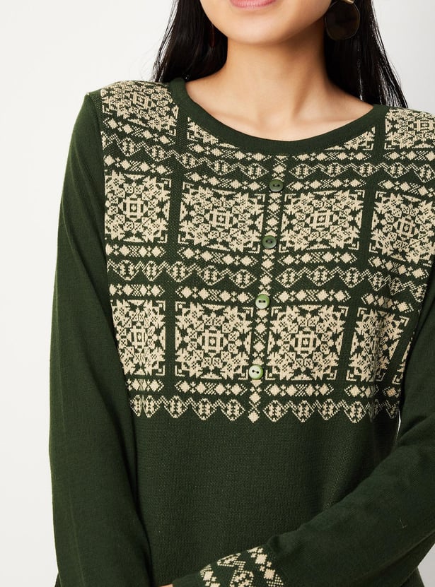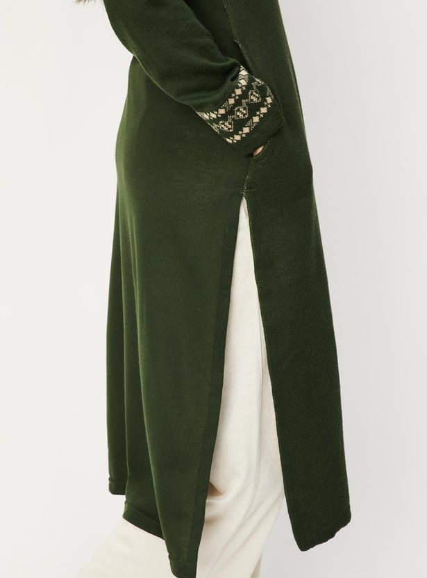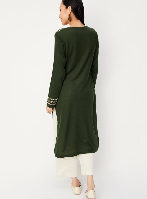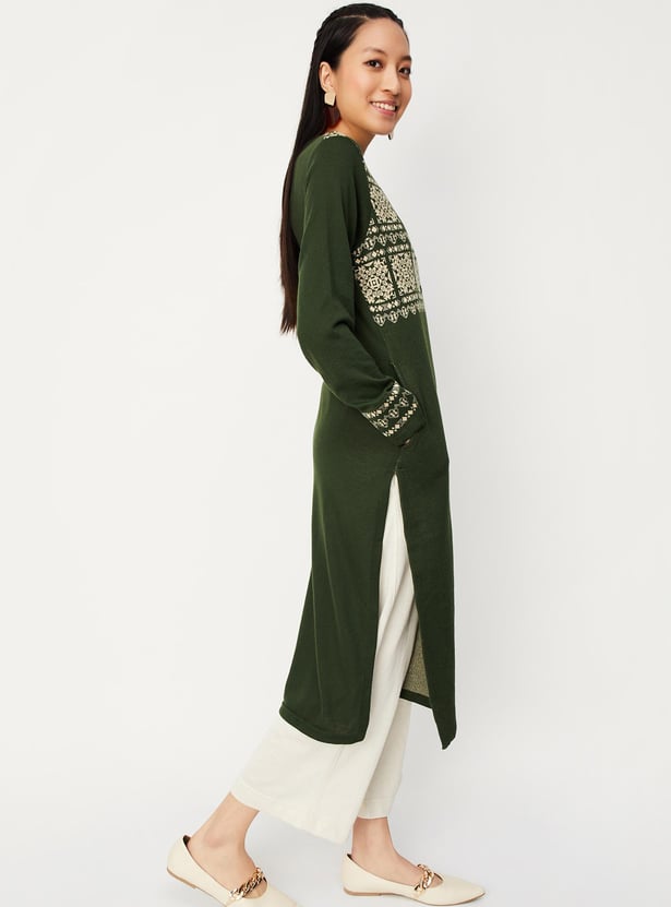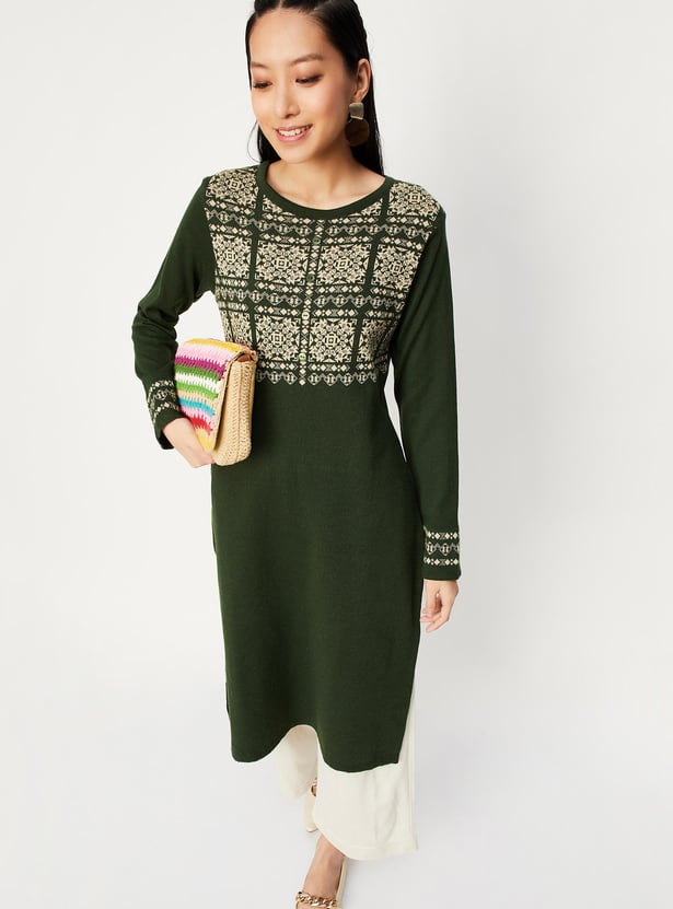 Raise the bar for winter styling with this straight kurta. It features a jacquard pattern at the yoke and cuffs, a round neckline, full sleeves, button accents, and a calf-length profile. Style this kurta with palazzos and ballerinas for an elegant look.