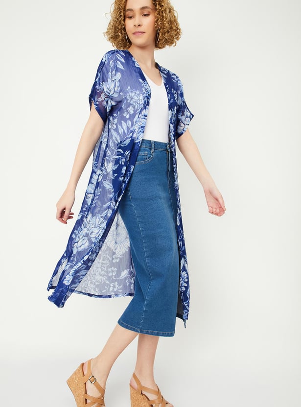 Add a breezy, elegant touch to your outfit with this floral-printed shrug. Featuring a front-open design, half sleeves, and knee-length construction.