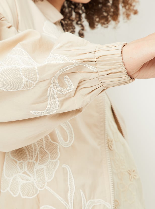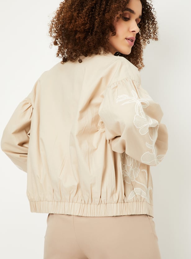 Elevate your fusion wardrobe with this stunning women’s reversible bomber jacket. One side features a vibrant floral print, while the other showcases intricate embroidery, allowing you to switch up your style effortlessly. With a zip front, full sleeves, and a classic collar, this jacket blends contemporary design with traditional elements.
