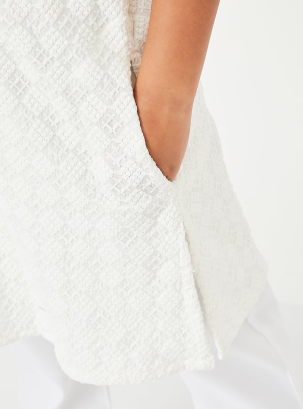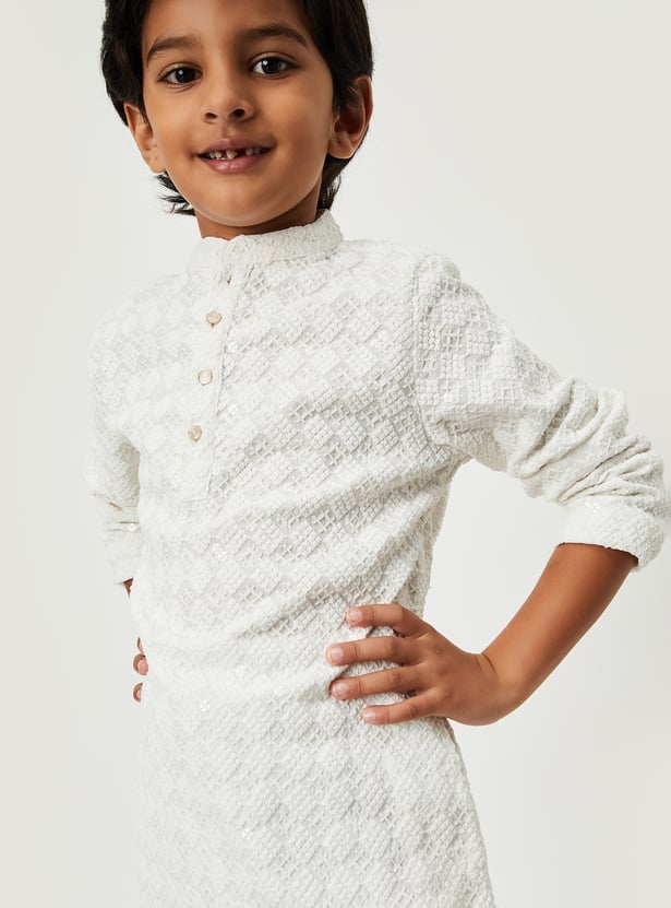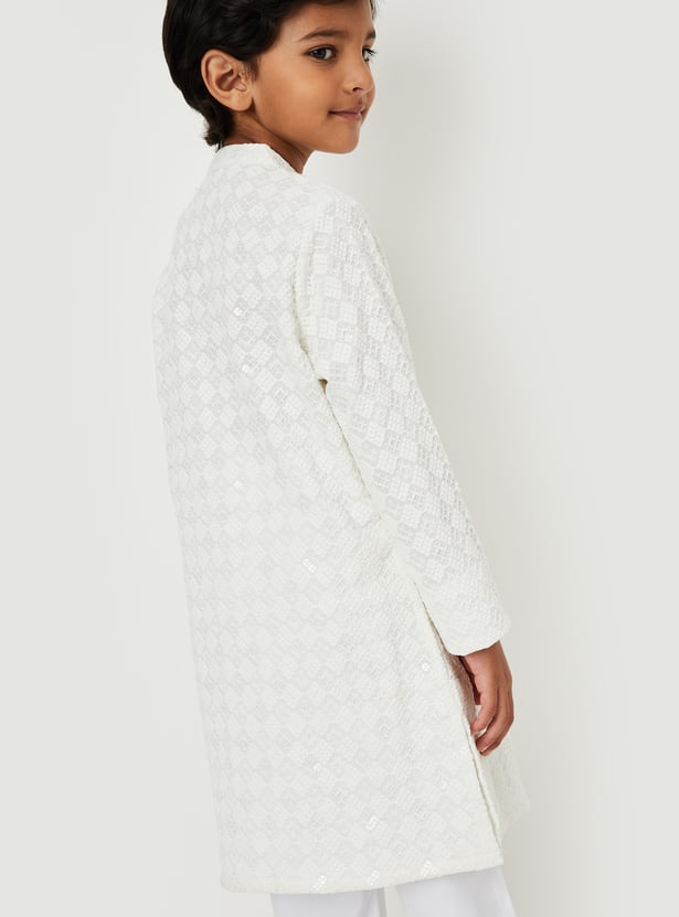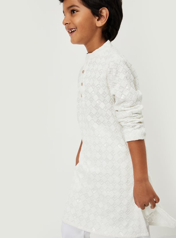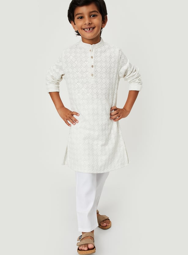 This classic kurta is a celebration of style and cultural elegance for your kid. It is tailored to perfection, featuring a band collar, an embroidered design, full sleeves, and a straight hemline.