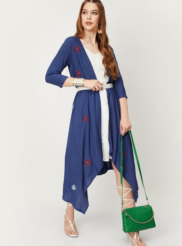 Add a hint of drama to your summer look with this jacket. It features all-over embroidery, an open front, three-quarter sleeves, and an asymmetric hem. Layer this jacket over a dress and gladiator sandals to slay your look.
