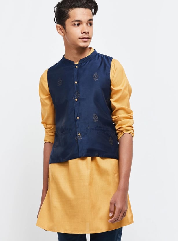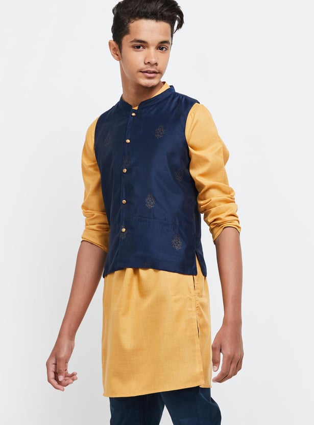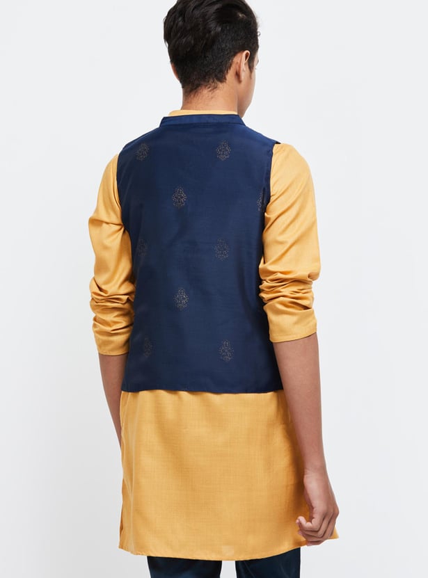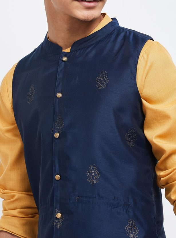 Add a fine ethnic casual touch to your style with this ethnic waistcoat, detailed with shimmery print, band collar, pockets, and straight hemline.