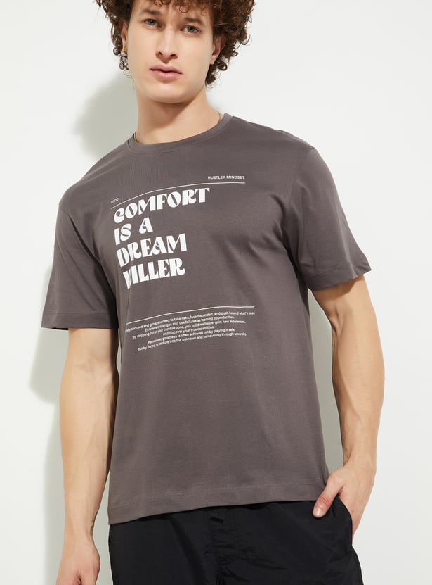 This printed t-shirt is the perfect addition to any casual wardrobe. Featuring a classic crew neck and half sleeves, it offers a comfortable fit while showcasing a bold, eye-catching typographic print.