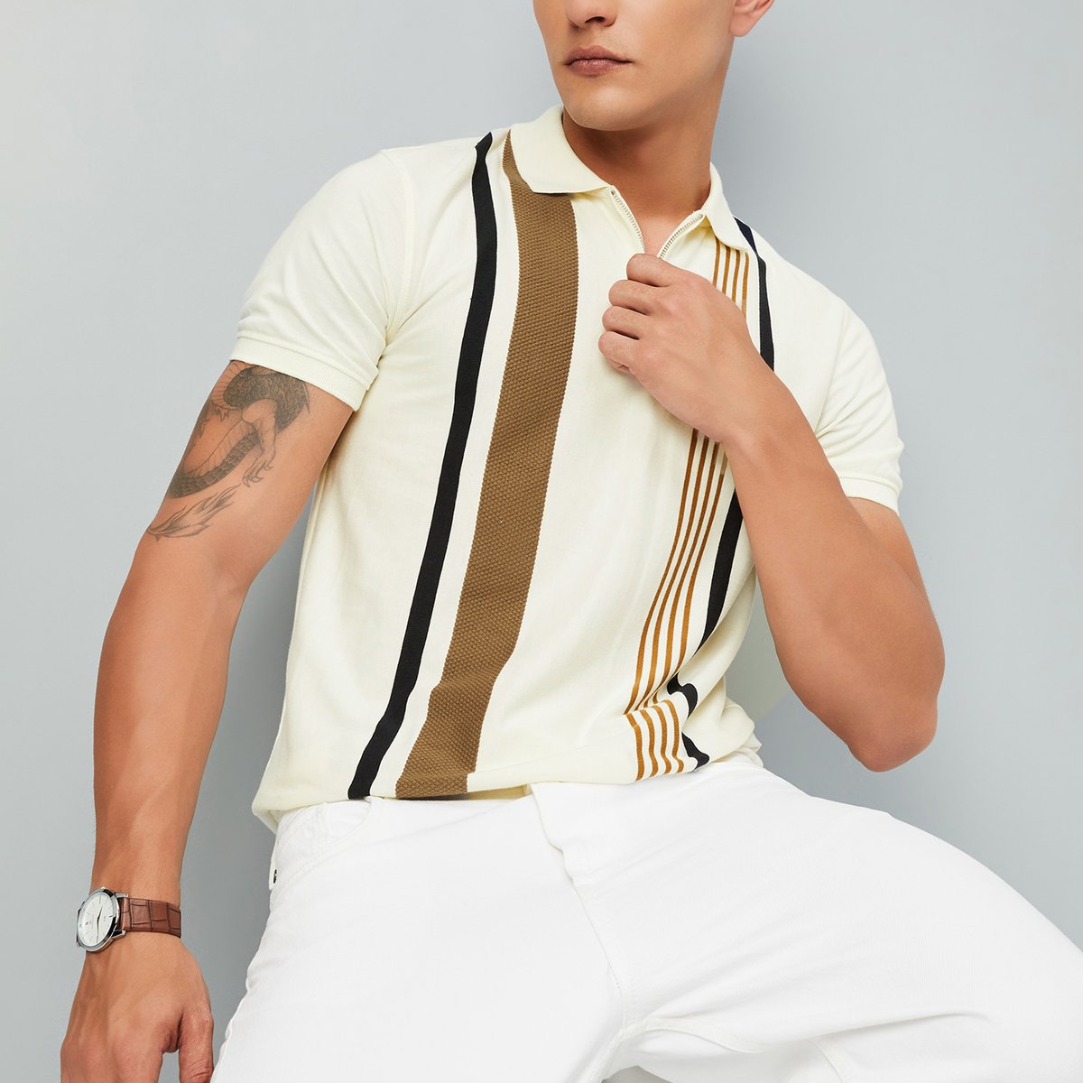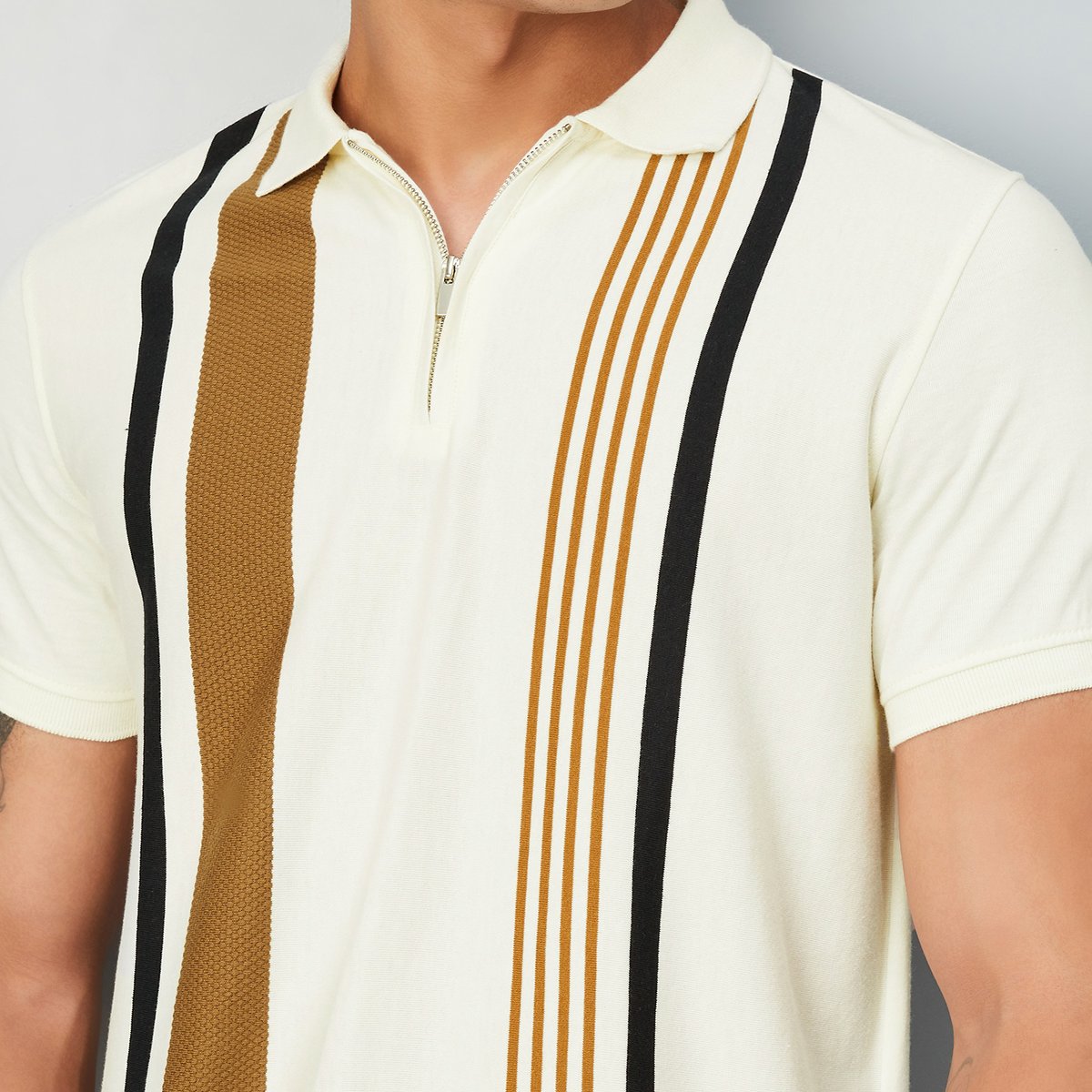 Enhance your style with this polo T-shirt. Featuring bold stripes, it comes with half sleeves and a zipper closure, adding a modern twist. The straight hem ensures a sleek, uncompromised stylish look, perfect for casual or smart-casual occasions.