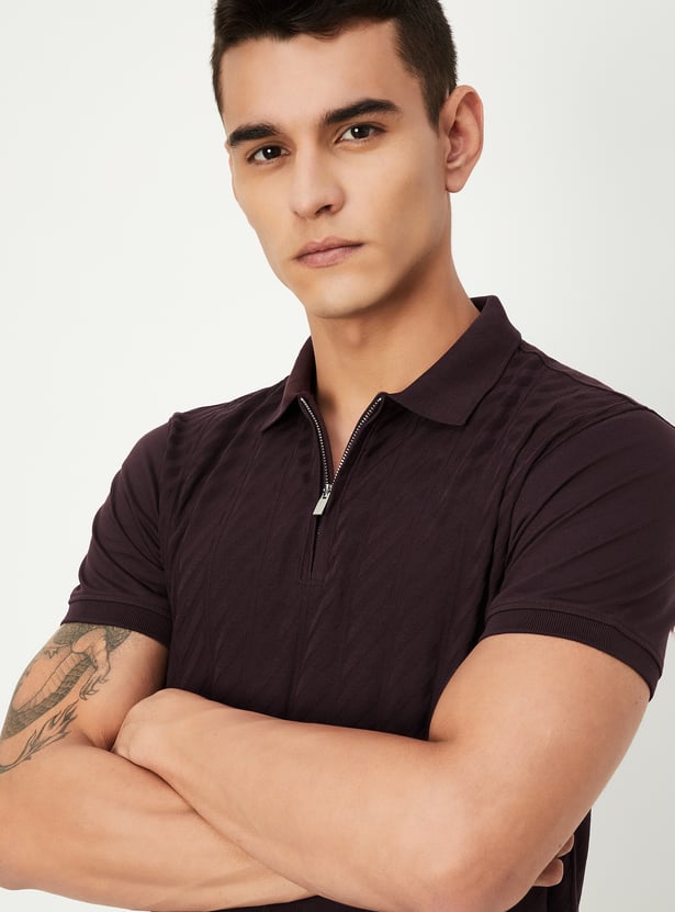 Men Slim Fit Textured Zipper Polo T-shirt