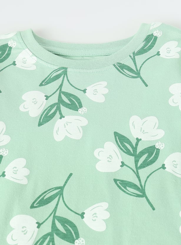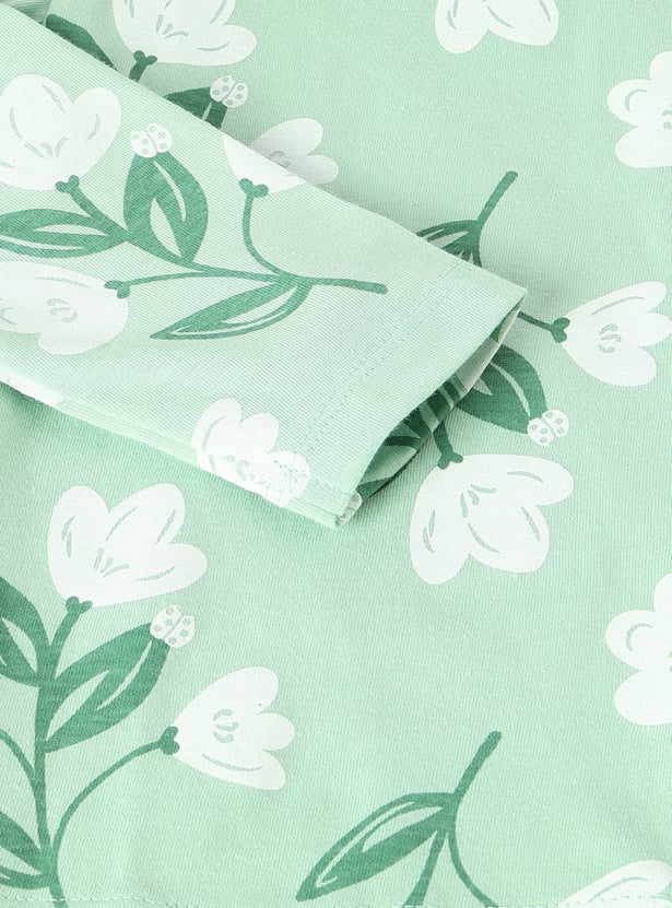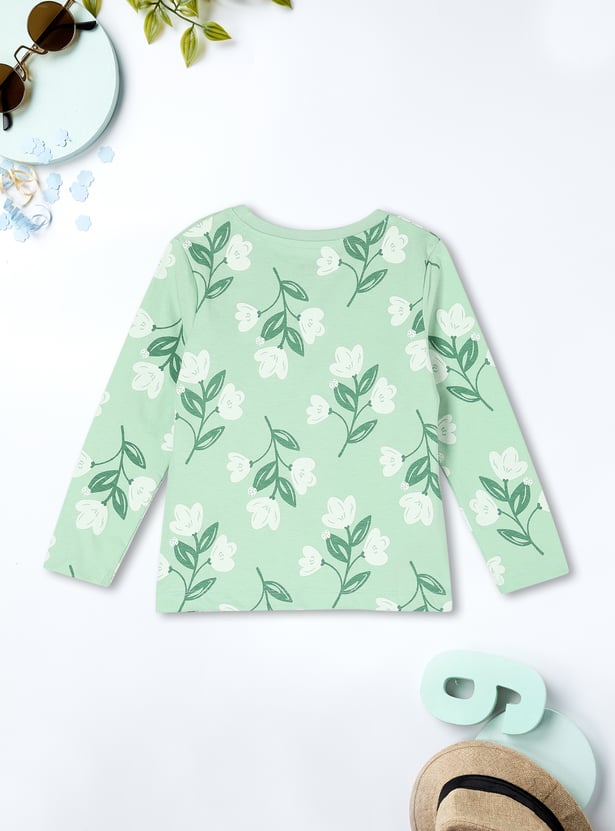 Highlight a stylish look for your little one at any event with this T-shirt. It features a charming floral print on the surface, a round neckline, and full sleeves, making it the perfect addition to amp up her casual collection.