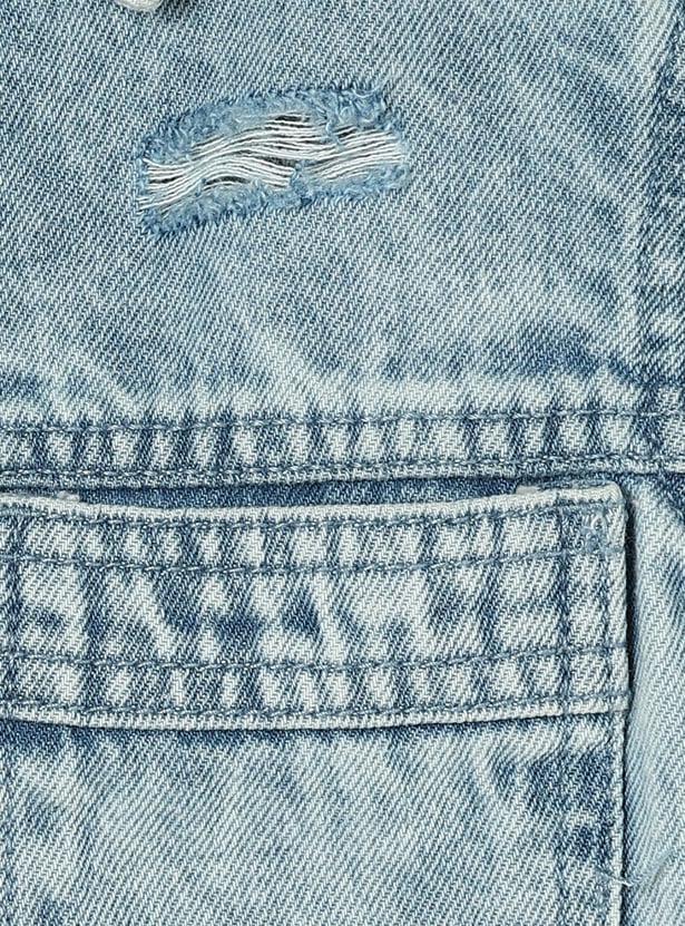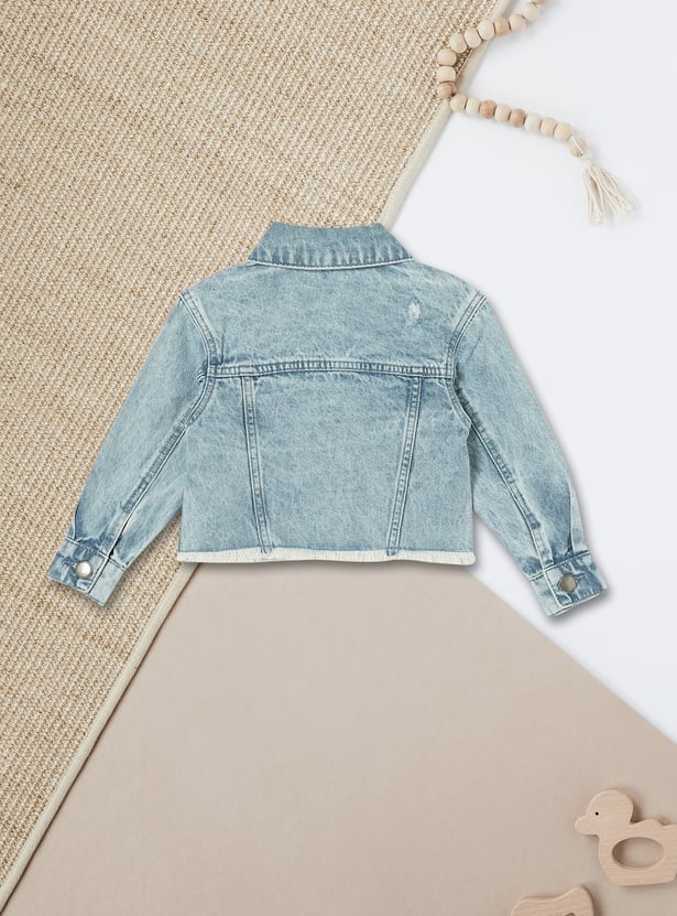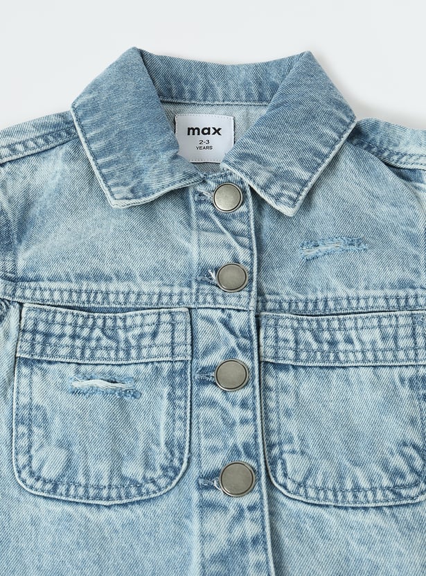Elevate your kid’s casual style with this essential denim jacket, featuring a washed finish, spread collar, full sleeves, and buttoned cuffs. Complete with pockets on the chest and a trendy frayed hem, it’s the perfect stylish layer for any laid-back look.
