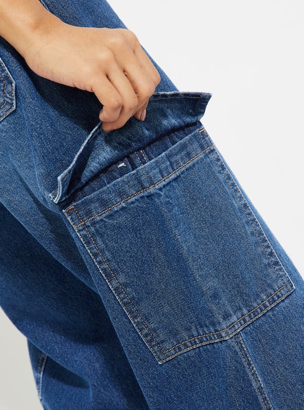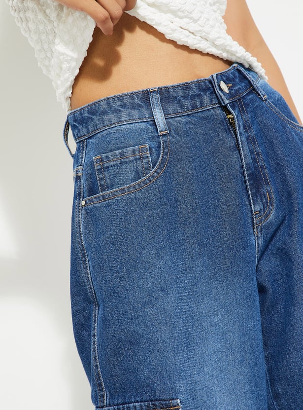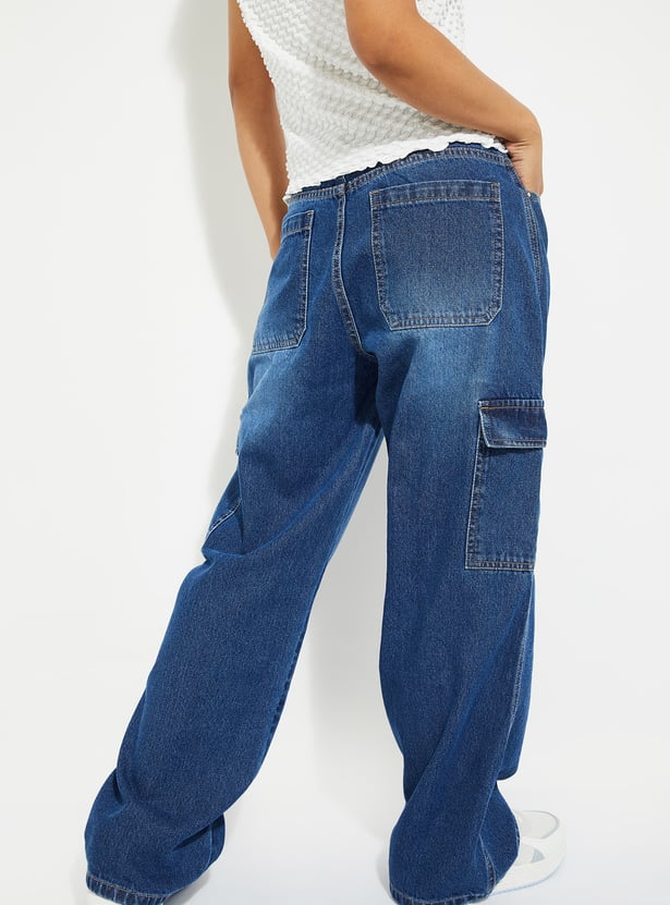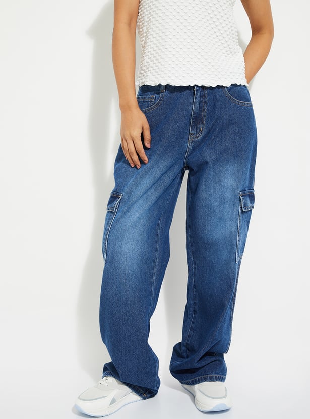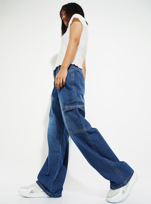 Conquer the day in style with this pair of jeans. The faded design adds a charming, laid-back vibe, while the belt loop waist, front and back pockets, and cargo pockets provide both function and fashion. With a wide-leg profile for roomy comfort and a high-rise fit for a flattering silhouette, these jeans are perfect for effortless, everyday style.