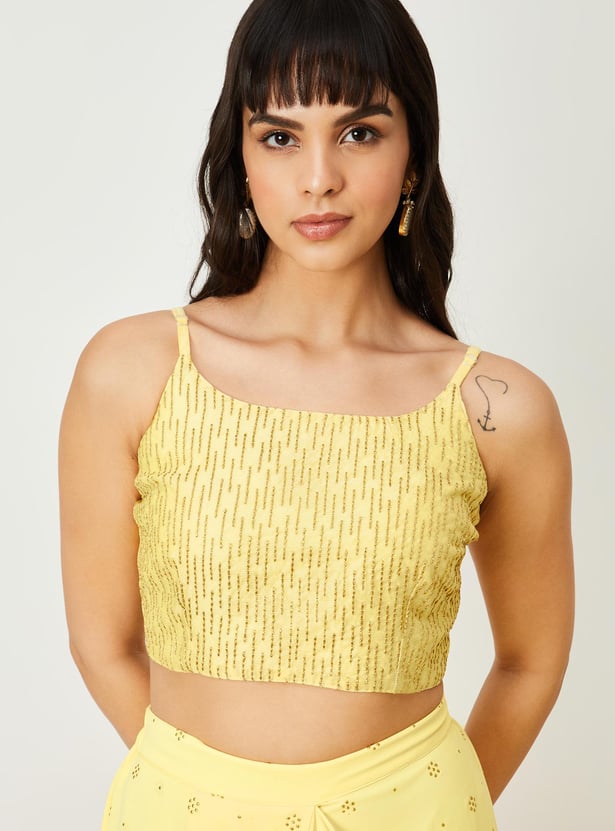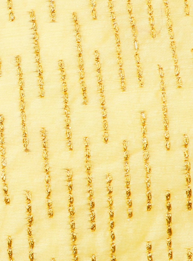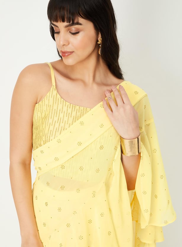 Glam up your look for the season with this saree set. It includes an embroidered blouse with a round neck, sleeveless construction, a back-button closure, and a crop profile. The pre-stitched saree comes with an elasticated waist, a long skirt, a pleated front, and an elegant pallu with ruffled detailing. Pair this saree set with flat sandals and a clutch to gear up for a memorable evening.
