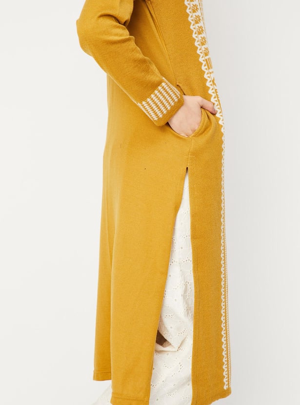 This jacquard kurta with a pocket is a stylish and practical addition to your wardrobe. The jacquard fabric adds an elegant touch, and the pocket provides functionality. Pair it with churidar pants and traditional mojari shoes for a classic and refined ethnic look that's perfect for celebrations and special events.