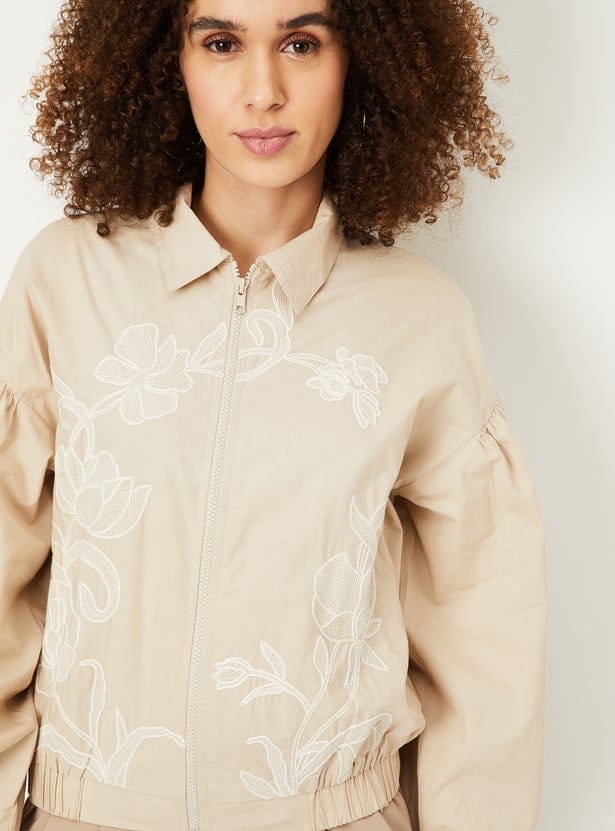 Elevate your fusion wardrobe with this stunning women’s reversible bomber jacket. One side features a vibrant floral print, while the other showcases intricate embroidery, allowing you to switch up your style effortlessly. With a zip front, full sleeves, and a classic collar, this jacket blends contemporary design with traditional elements.